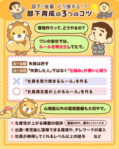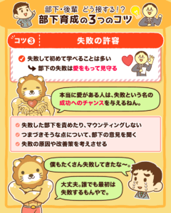 失敗は成長の機会なので、部下の失敗は愛をもって見守りましょう。