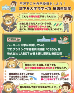 聴講生制度や、CS50のような無料学習教材など、学ぶ気がある人にとって、歴史的に見て今ほど恵まれた環境は無いでしょう。