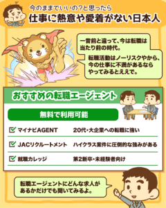 今の仕事や職場に「熱意・愛着」が持てない人は、転職エージェントに連絡して、「自分には〇〇の経歴があります。どんな求人がありますか?」と聞いてみるだけでも良いでしょう。