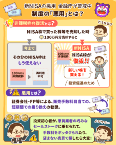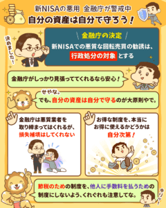 このような状況を防ぐため、新NISAでの悪質な回転売買の勧誘は行政処分の対象になると決まったようです。