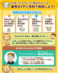 ちなみに、「良いFPを紹介してほしい」という人におすすめできるFPさんは、秋山 芳生(よしお)氏です。