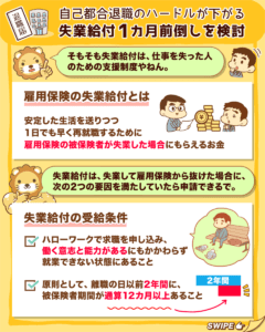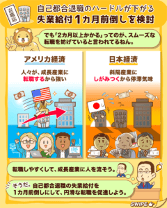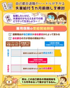要は、「会社都合でいきなり辞めさせられた人は、急いで助けてあげる」一方で、「自分の都合で辞めた人は、急いで助けない」というワケです。(下図参照)