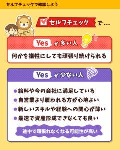 時間と体力を差し出してもなお、副業を頑張り続けられる人は、先ほどの質問に対して「Yes」が多い人です。