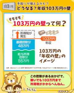 基礎控除48万円、給与所得控除55万円を合わせると103万円になります。