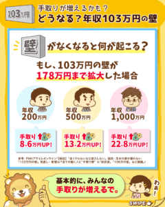 仮に103万円の壁が178万円まで拡大した場合、基本的に皆さんの手取りは増えます。