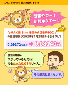 三菱UFJアセットマネジメントは、2025年1月25日から「eMAXIS Slim 米国株式(S&P500)」の信託報酬を年0.08140%以下に引き下げると発表しました。