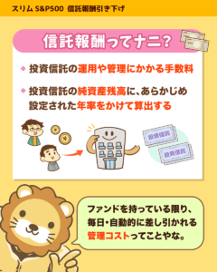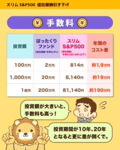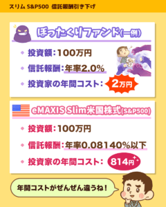 一方、eMAXIS Slim 米国株式(S&P500)の信託報酬が0.08140%になると、100万円投資しても年間たったの814円しかかかりません。