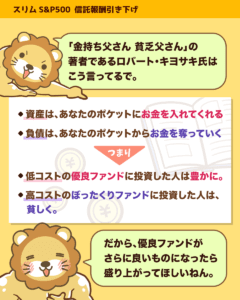 低コストの優良ファンドに投資した人は豊かになり、高コストのぼったくりファンドに投資した人は貧しくなるワケです。