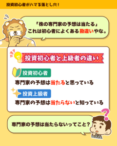 - 株の上級者:専門家の予想は当たらないと知っている。信じられるのは自分のみ。