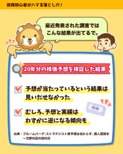 仮に本当に正確な予想ができる人がいるのであれば、その人は証券会社で働いていたり予想を公表していたりはせず、自分のためだけに運用しているはずです。