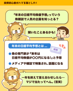 例えば株雑誌では毎年「年末の日経平均株価予想」といった企画が組まれ、著名なストラテジストが予測を公表しています。