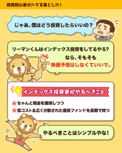 - 低コストかつ広く分散された優良なインデックスファンドを長期で保有する