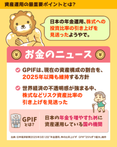 7つ目のニュースは、2025年3月12日の日本経済新聞から、「年金運用、株の比率上げず GPIF「25%ずつ配分」維持」です。