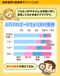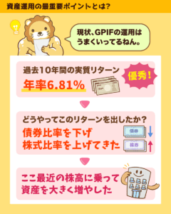 つまりGPIFは債券への投資比率を減らして株式への投資比率を増やすことで、ここ最近の株高に乗り、資産を大きく増やしてきたワケです。