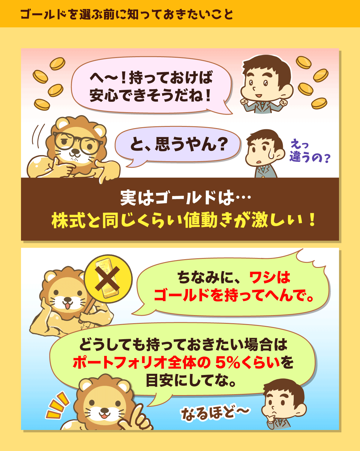 ただし検討した結果ゴールドを保有する場合でも、ポートフォリオの5%程度を目安にしてください。(※保有をおすすめする意図ではありません。)