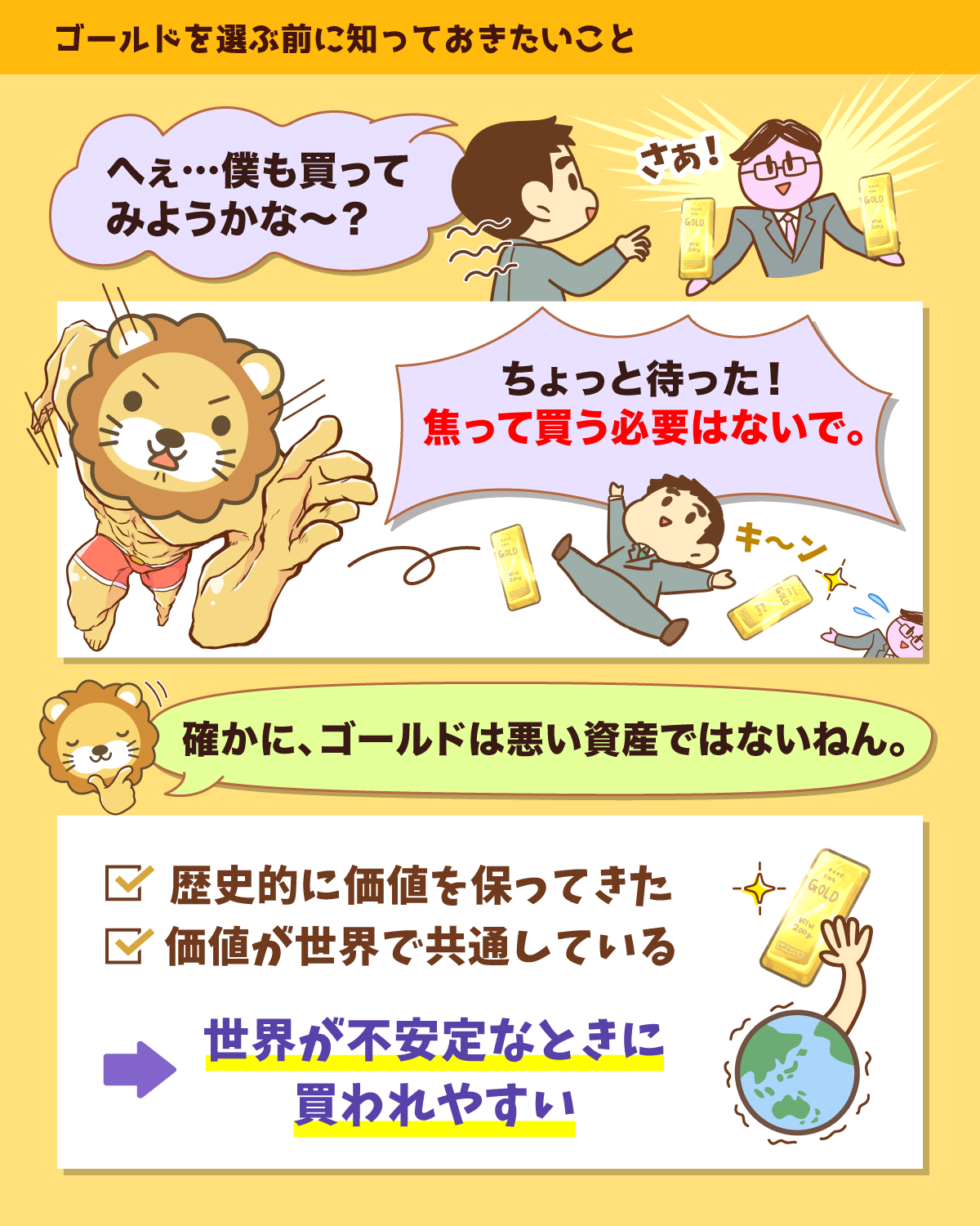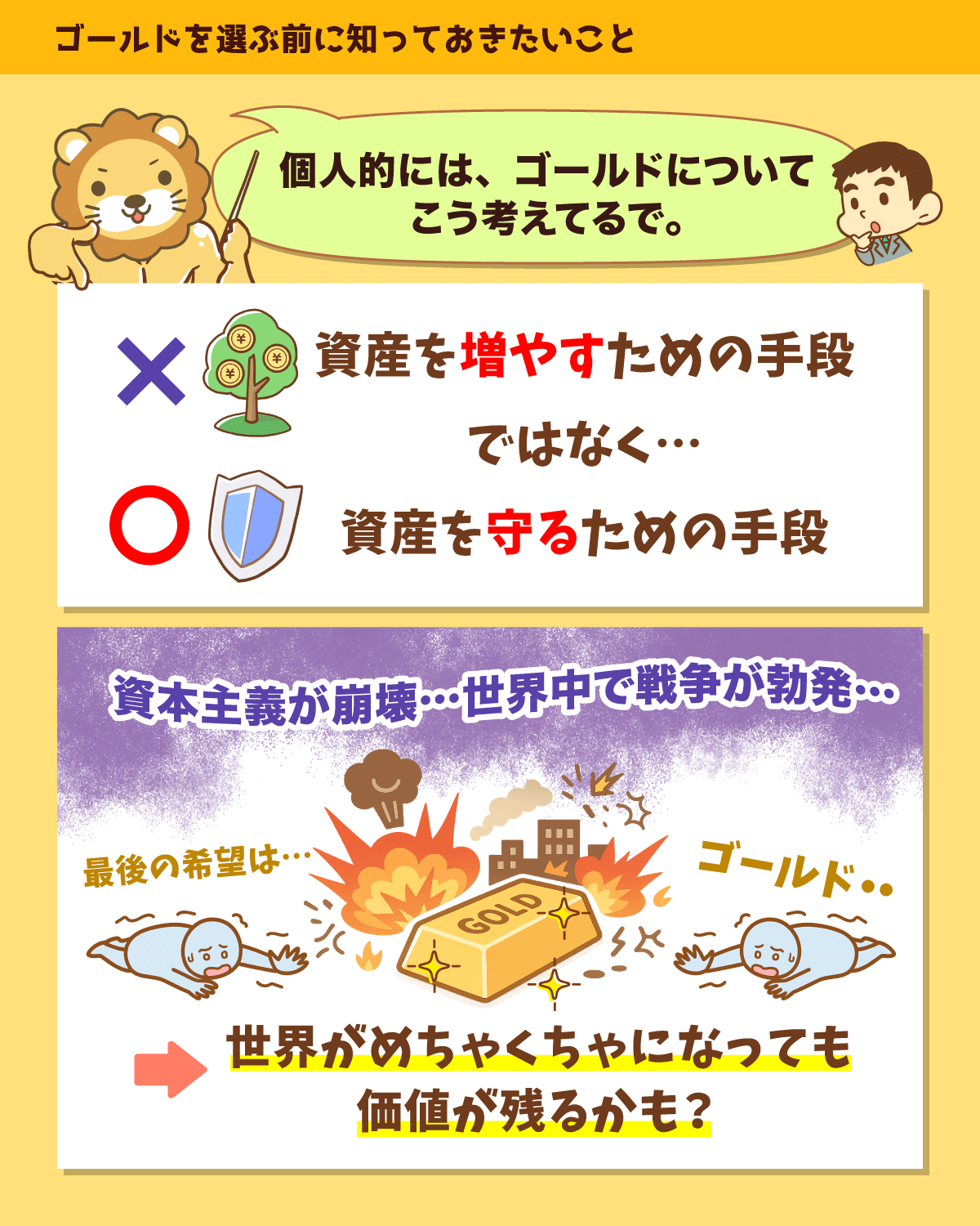 ゴールドは資産を増やすためのアセットではなく、資産を守るためのアセットです。