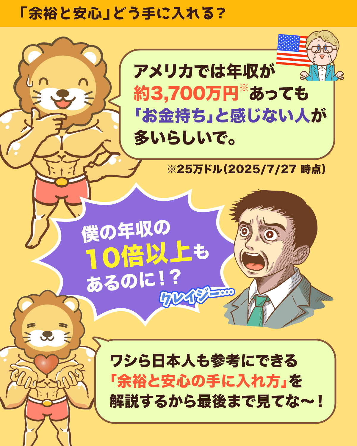 アメリカでは、年収25万ドル(約3,600万円)という高所得者層でも、自分のことを「お金持ち」だと感じられていないというニュースです。