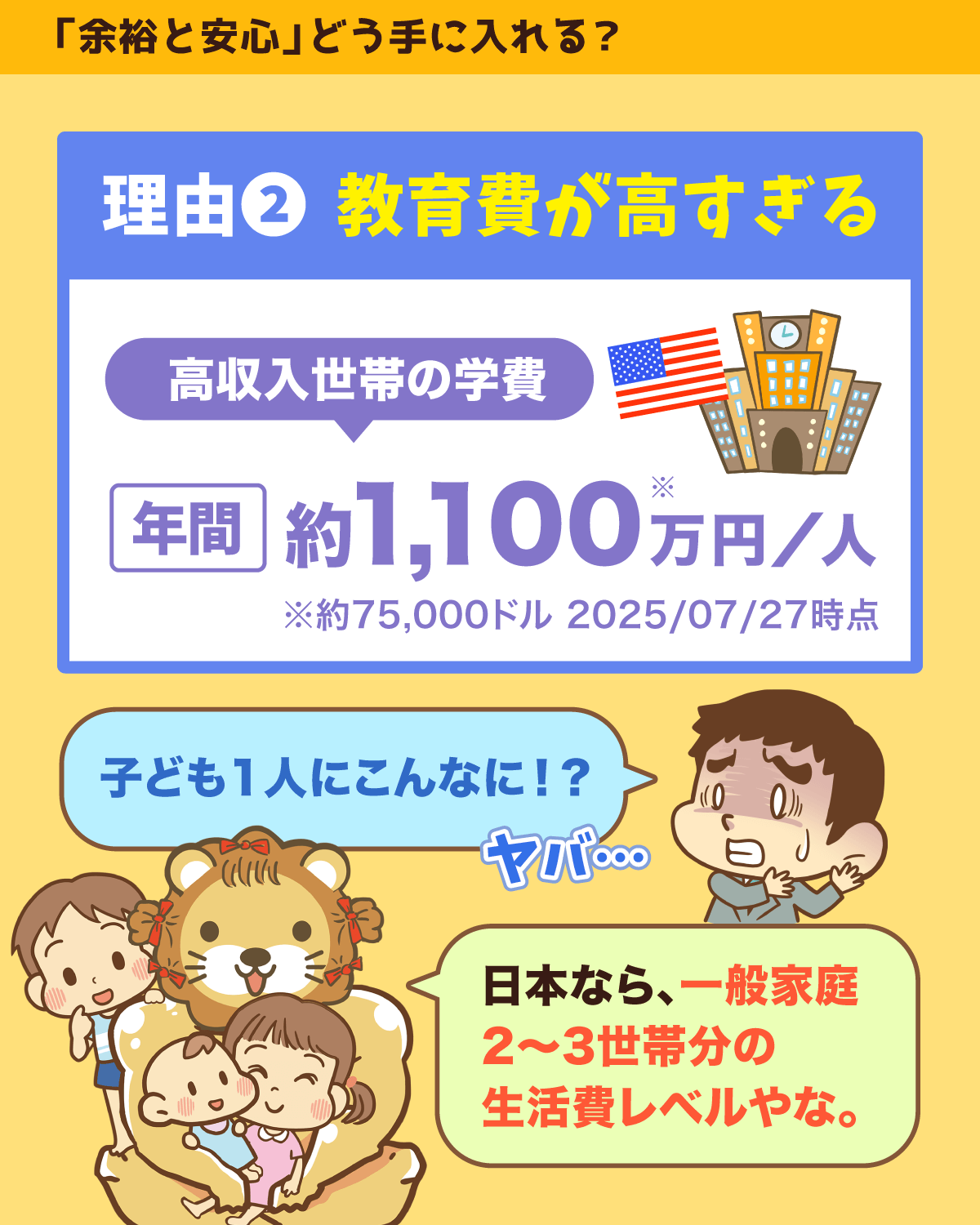 高収入世帯では、子ども1人の学費に年間75,000ドル(約1,100万円)かかるケースもあるそうです。