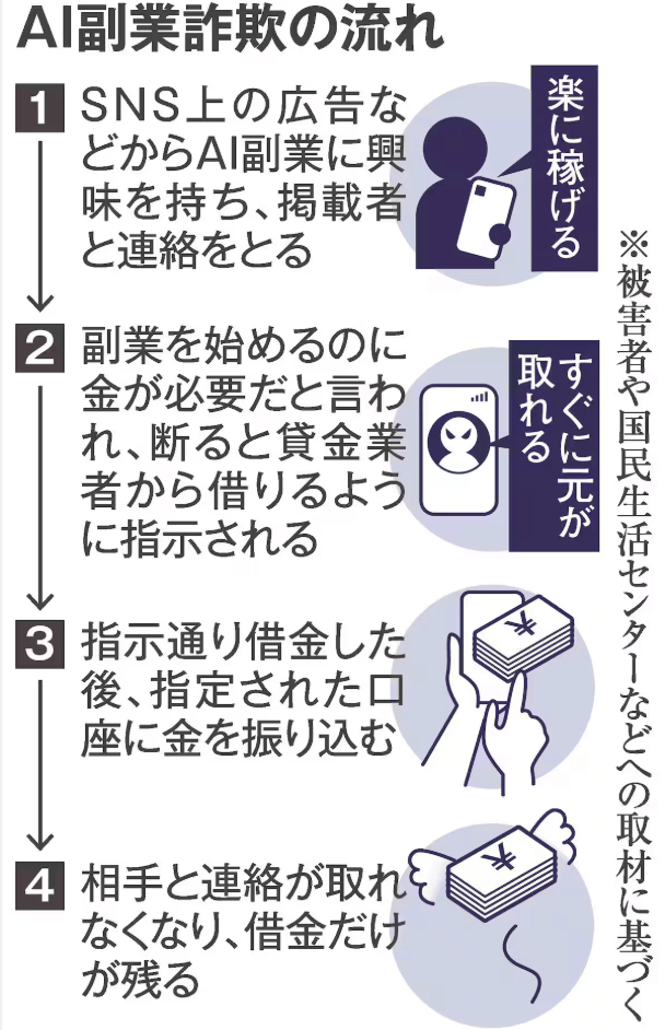 2つ目のニュースは、2025年8月21日の産経新聞から、「「AIで楽に稼げる」の言葉に潜む罠、借金200万円背負うケースも SNSの広告に注意」です。