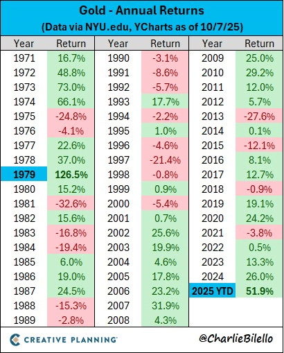 以下の表は、1971年以降のゴールドのリターン(ドル建て)を表しています。