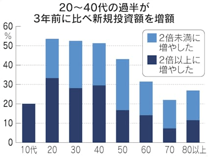 縦軸が3年前と比べて投資額を増やした人の割合で、横軸が各年代です。