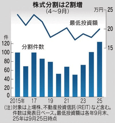 2つ目のニュースは、2025年9月26日の日本経済新聞から、「株式分割、12年ぶり高水準 4~9月124件」です。