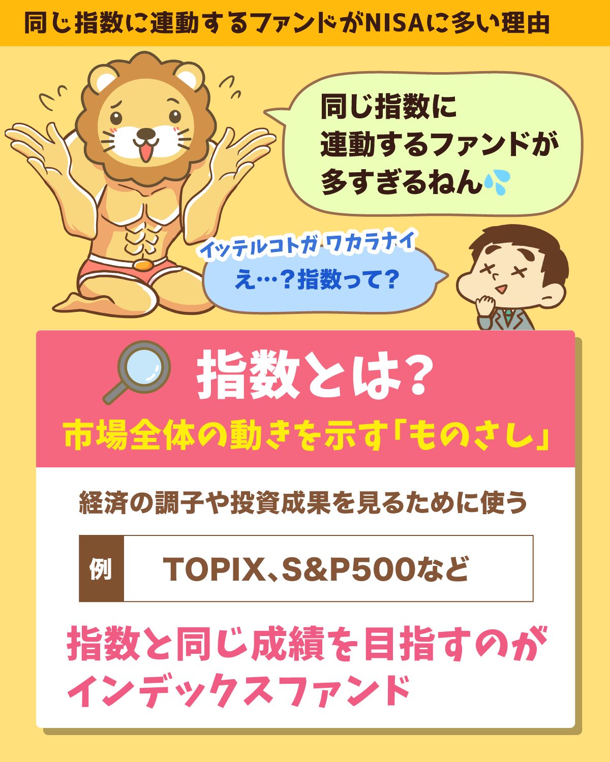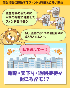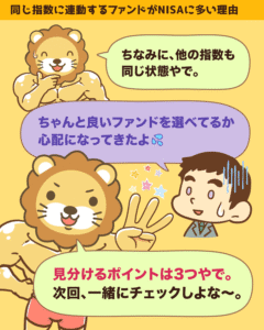 皆さんの周りで、なぜ同じ指数に連動しているファンドが多いのか、どのような理由でファンドを選んだのかといった話が出るかもしれません。