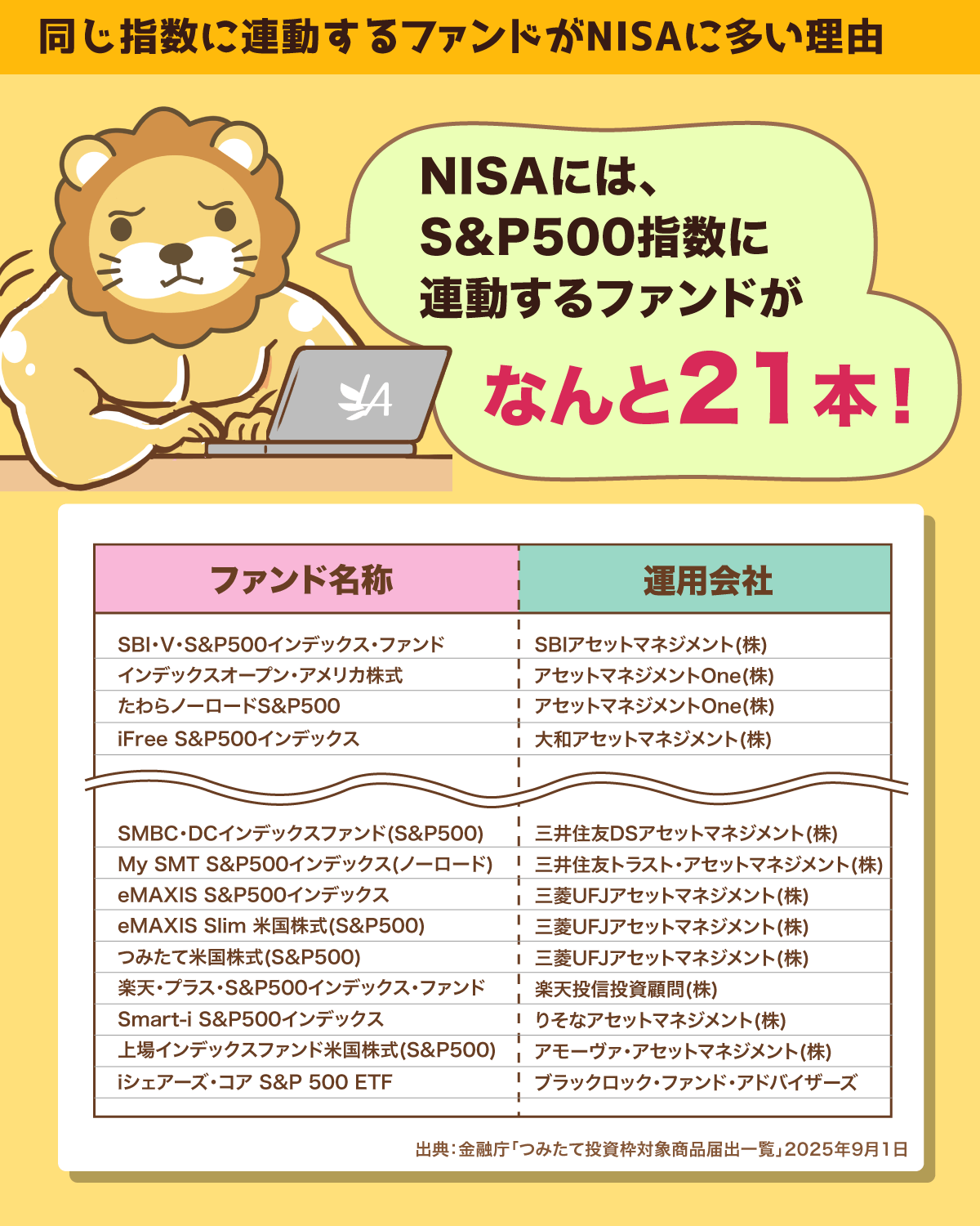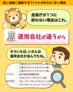 S&P500に連動するファンドが11本もある理由は、運用会社が違うからなのです。