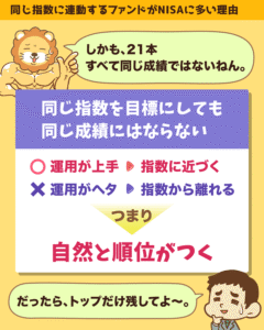 つまり、万が一自分の投資しているファンドが1位ではなかったとしても、パニックを起こさなくても大丈夫ということです。