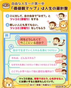 そのため自分以外にも一緒に価値観マップづくりにチャレンジしている人がいると頑張れますし、お互いにツッコミをし合えれば、自分ひとりでマップを作るだけでは気づけない考えや言葉を引き出せることがあります。